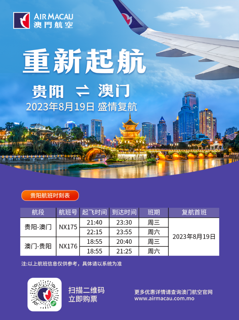 贵阳网•甲秀新闻讯 8月1日,记者从贵阳市文化和旅游局获悉:贵阳至澳门的航班即将在8月19日复航,初期航班将在每周三、六执飞。