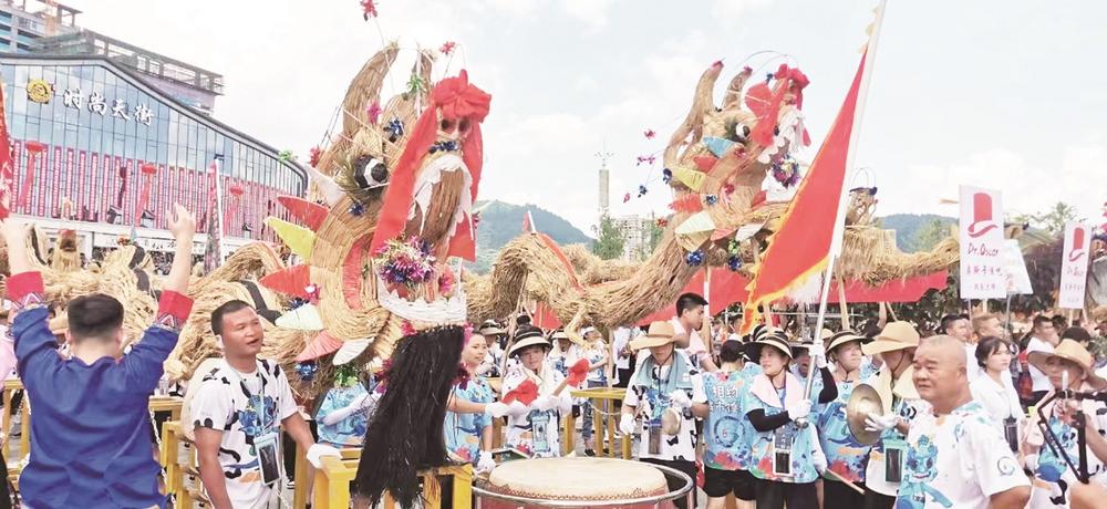 沿街向前,随龙起舞的还有老年人的广场舞、中年人的民族服装舞、青少年学生的街舞和轮滑表演,最夺人眼球的是荆角乡12人牵牛对山歌,把乡土元素融入新时代城市的欢乐之中,让人耳目一新。