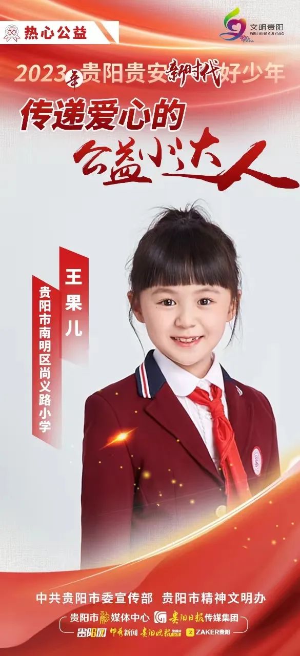 王果儿,女,2014年7月出生,贵阳市南明区尚义路小学三年级学生。王果儿犹如一位爱心小天使,和同学一起向花溪久安小学、六盘水银山小学、毕节市织金县龙场镇双山小学的小朋友们捐赠生活和学习物资。她用压岁钱每月向联合国儿童基金会进行捐赠,以微薄之力帮助国内留守未成年人走出困境、健康成长。王果儿还积极参与各类公益活动,如参与全国交通安全日主题宣传、参与用电安全宣传短视频拍摄、参与冬奥重唱“北京欢迎你”活动等。她以实际行动践行着心中的社会主义核心价值观,争做明礼尚义的新时代好少年。