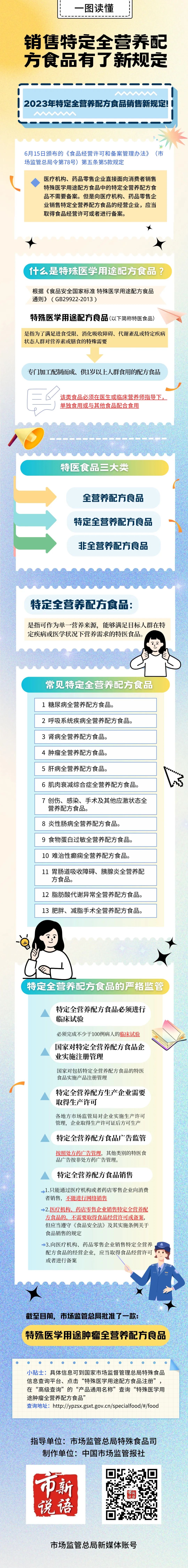 6月15日颁布的《食品经营许可和备案管理办法》(市场监管总局令第78号),对销售特殊医学用途配方食品中的特定全营养配方食品明确了新要求,向医疗机构、药品零售企业销售特定全营养配方食品的经营企业,应当取得食品经营许可或者进行备案。