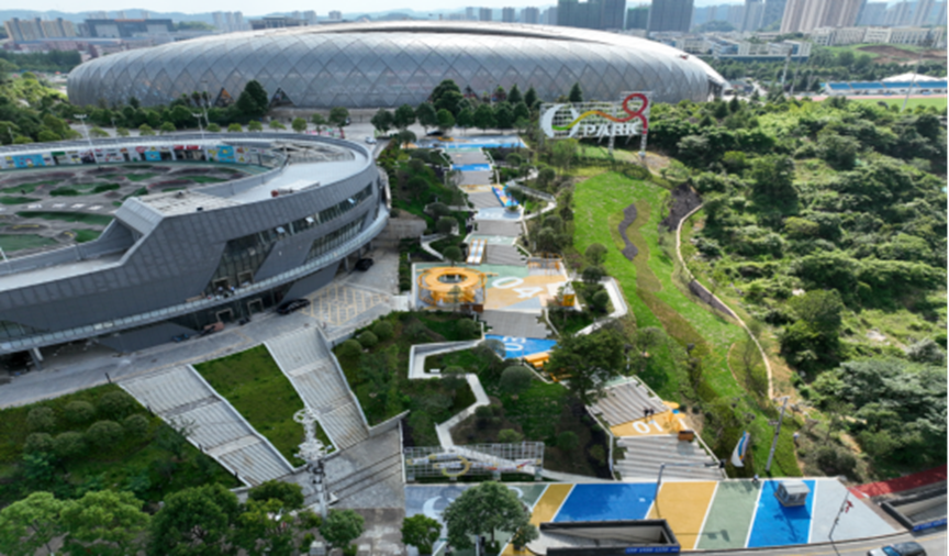奥体中心是一个集体育赛事、全民健身、文艺汇演等多功能于一体的综合性体育场馆。同时,体育场周边的空地很大,在泵道公园可以骑车、滑轮滑、散步、遛娃,作为贵阳市的地标性建筑物之一,不仅是一座体育场馆,更是一座城市文化中心。