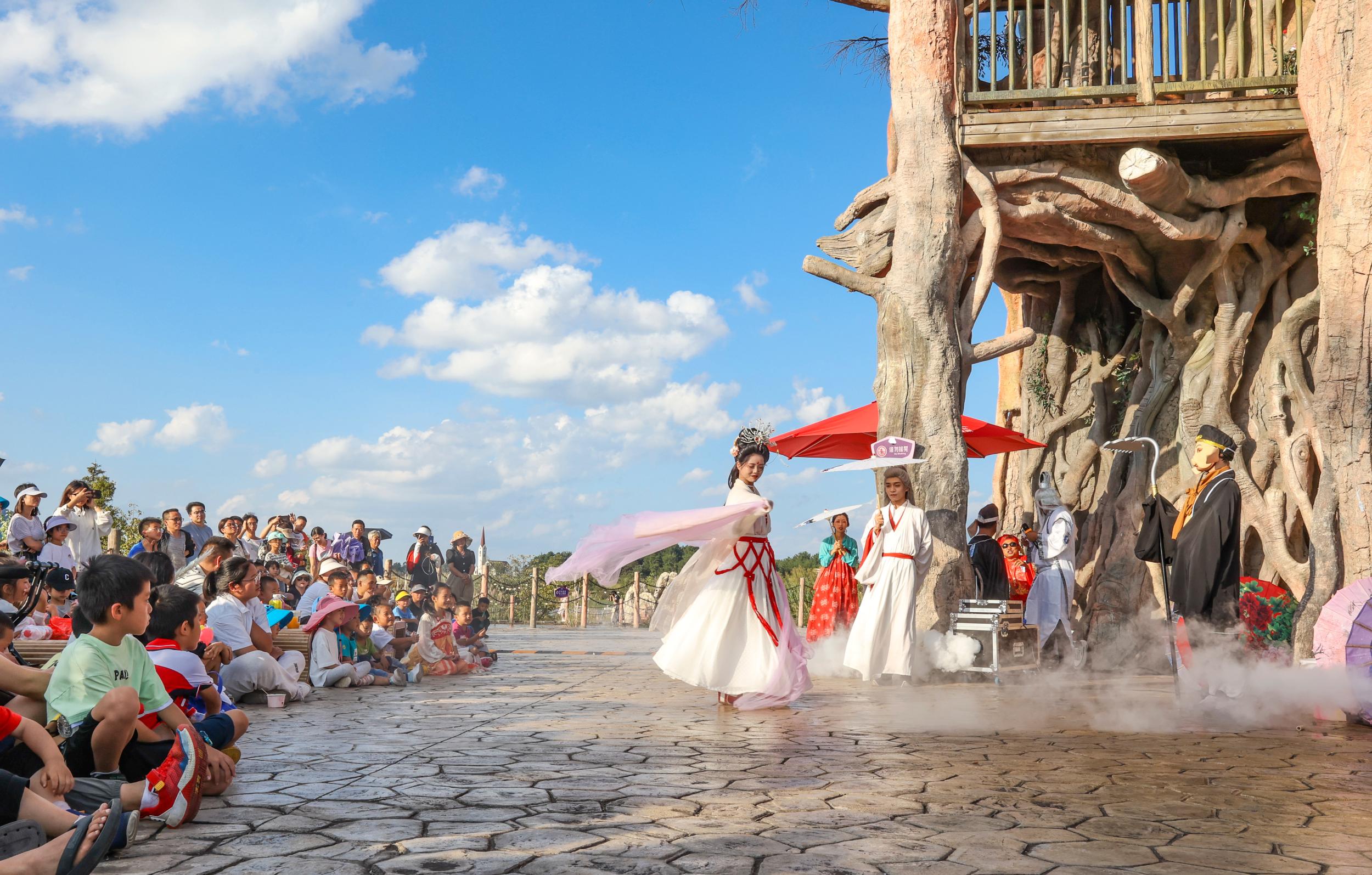 群仙迎宾、众神巡游、蟠桃盛宴、洪荒集市……9月29日至10月6日,云漫湖携手贵安新区文旅投瑞士小镇,举办大型神话游园会活动,期间,景区客流量达3.42万人次,实现旅游收入200余万元。在蟠桃盛宴上,游客不仅可以吃到由工作人员分发的“蟠桃”,还可以观看喷火、变脸等非遗节目。