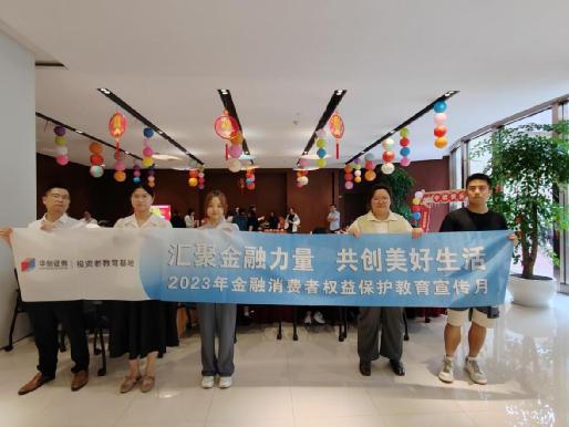 9 月 26 日,华创证券投教基地联合华创证券上海世博馆路证券营业部在华能上海大厦开展 2023 年 " 金融消费者权益保护教育宣传月 " 投教活动,此次活动以 " 汇聚金融力量 共创美好生活 " 为主题,旨在向投资者普及金融知识,揭露非法金融活动,倡导理性消费理念,提升社会公众金融素养,共同营造和谐健康金融环境。