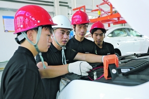 学生在贵州装备制造职业学院汽车实训中心进行实训。