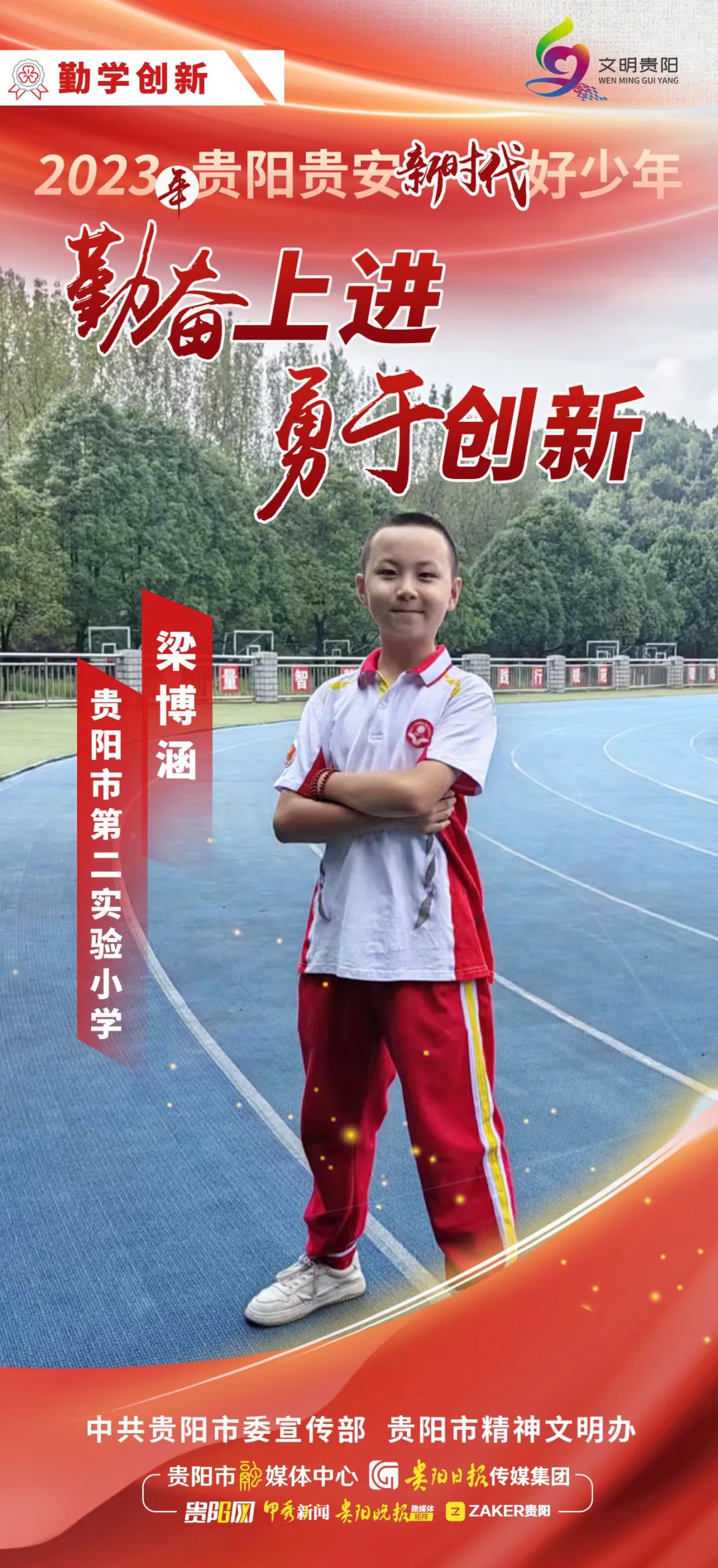 梁博涵,男,2011年1月出生,贵阳市第二实验小学六年级学生。他是一名阳光灿烂、向上向善的追梦少年,综合成绩长期稳定在全校前列,好学上进、品学兼优。梁博涵对科学充满好奇,是勤奋创新、乐于探索的科学小达人。他从小挚爱人工智能,痴迷于电脑编程。2022年,他克服困难积极参加第十三届蓝桥杯全国软件和信息技术专业人才大赛,获得贵州省竞赛一等奖和全国总决赛三等奖。为了让老师上课时不受粉笔灰尘伤害,他查资料、做实验、搞调研,用三个月时间发明了无尘黑板擦,获得贵阳市首届青少年设计思维大赛二等奖。小小的发明、至诚的初心,他赢得了广泛称赞,成为一名懂感恩、担责任、乐创新的新时代好少年。