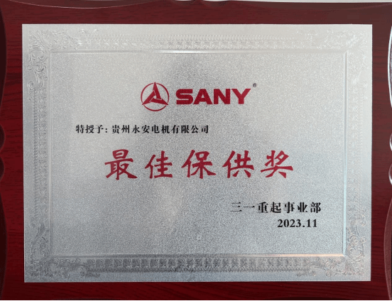 近日,以“提质增效·聚力谋远,上下同欲·扬帆起航”为主题的2024年度三一重起事业部供应商大会在湖南长沙成功举办。继两次获得“优秀供应商”称号后,贵州永安电机有限公司(以下简称“贵州永安”)再次凭借可靠的产品质量、有力的供货保障和良好的配套服务得到客户认可,荣获“最佳保供奖”。