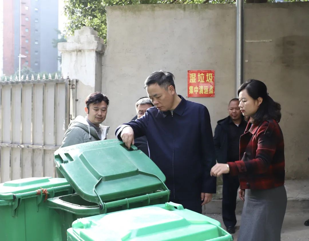 王黔一行先后来到枫林小区、万科公园传奇、银通山庄、百腊井小区,看现场、听汇报,揭盖查看垃圾分类落实情况,详细了解生活垃圾分类收集房建设、管理运营、“两网融合”建设工作推进情况。