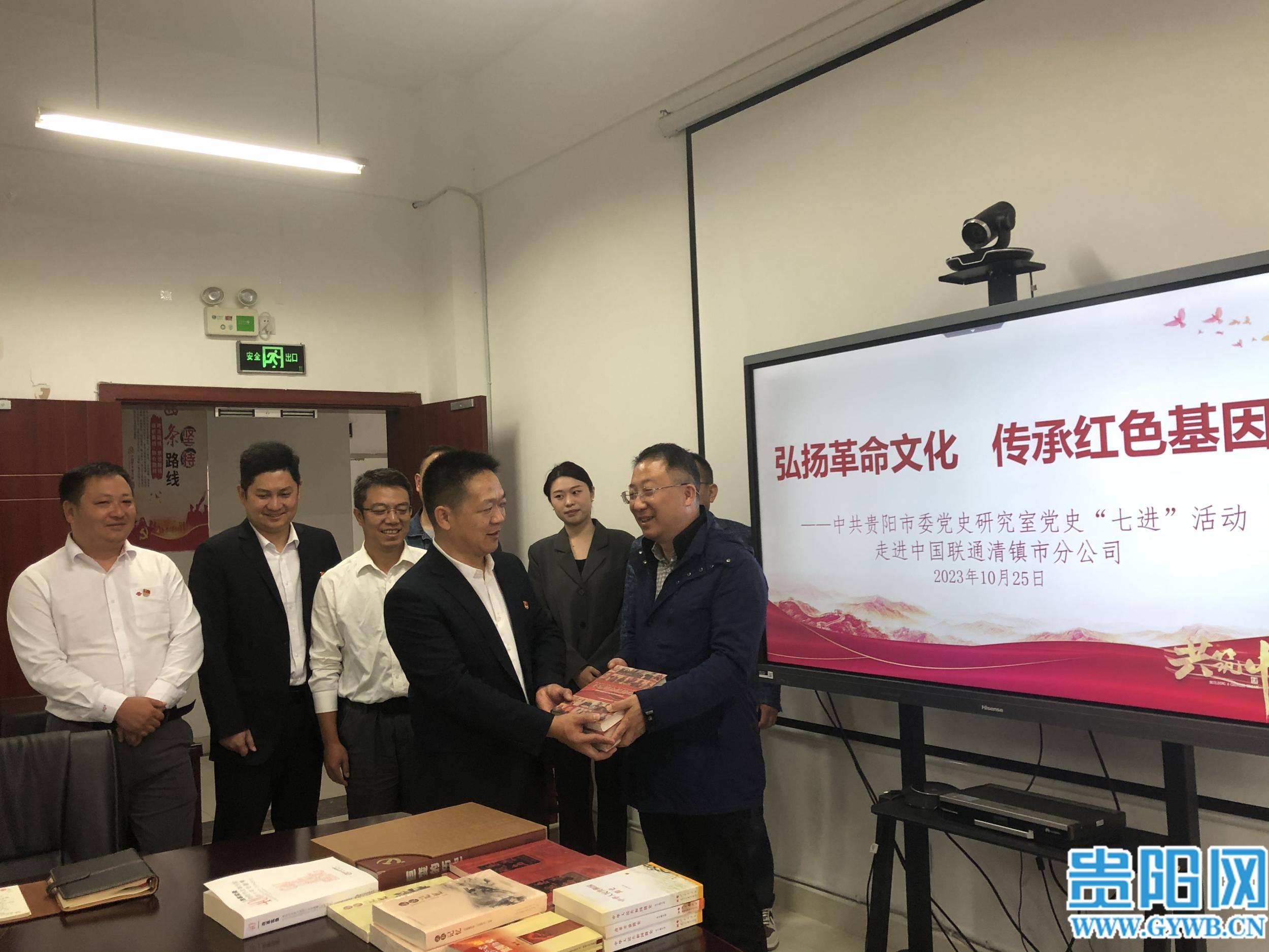 贵阳市委党史研究室向中国联通清镇市分公司赠送了《中华人民共和国简史》《习近平关于全面依法治国论述摘编》《中国共产党贵阳历史》《抗战记忆》《三线记忆》《魂系乌蒙——中共贵州省工委斗争纪实》等书籍,助力企业开展党史学习教育。