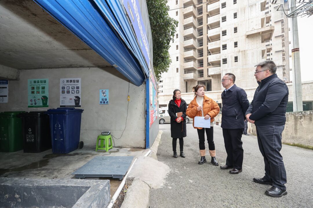 王启云一行先后来到银海元隆A区、花香上海城小区、中天花园御翠岭社区,实地调研废旧物资回收点和生活垃圾收集点“两房”建设、使用情况,现场协调解决存在的困难和问题。