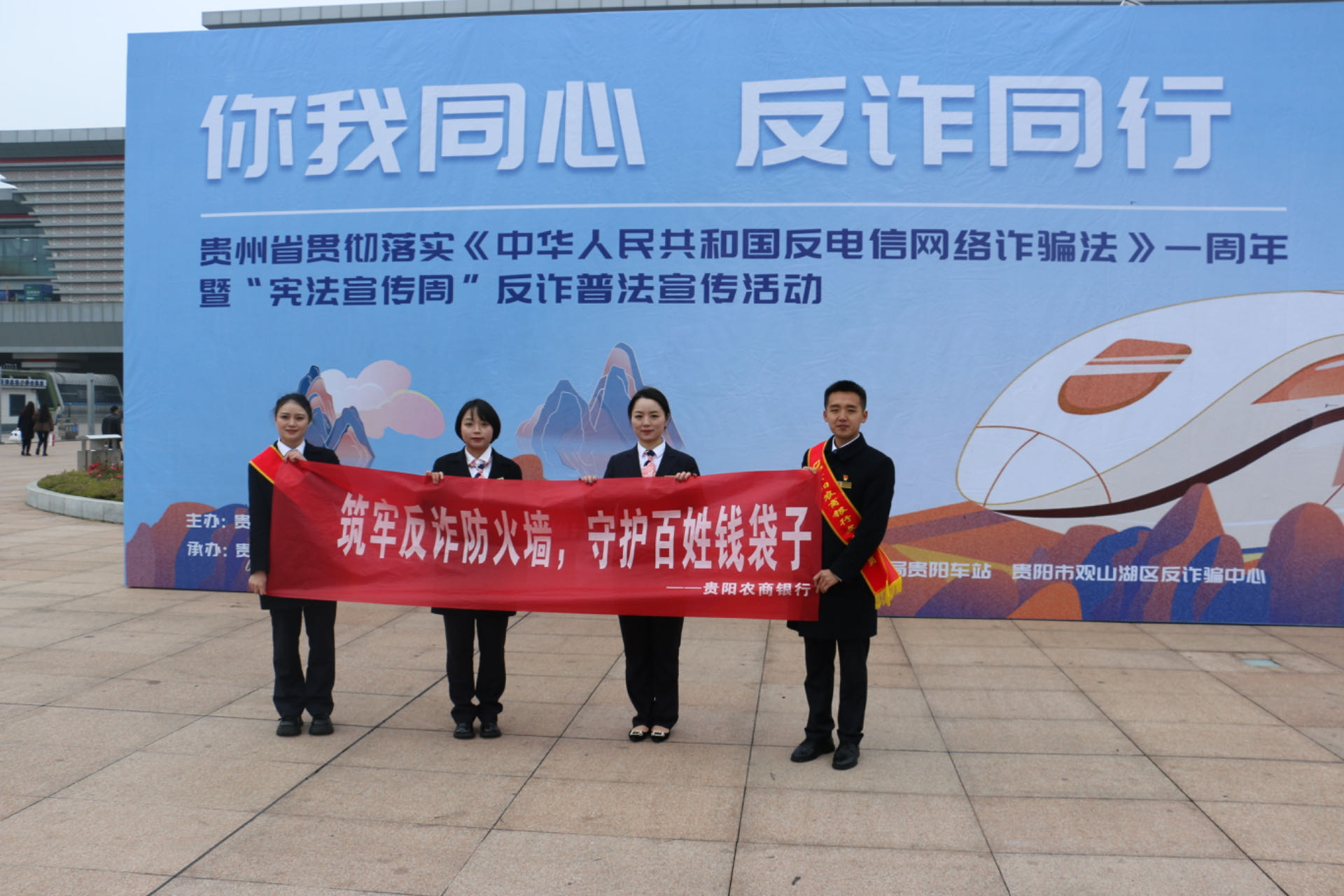 近日,贵州省贯彻落实《中华人民共和国反电信网络诈骗法》一周年暨“宪法宣传周”反诈普法宣传活动在贵阳北站西广场举行。贵阳农商银行作为特邀单位之一,积极响应参与活动。由贵阳农商银行科技支行组织成立的宣传小分队围绕“筑牢反诈防火墙,守护百姓钱袋子”主题在现场开展了系列反诈宣传。