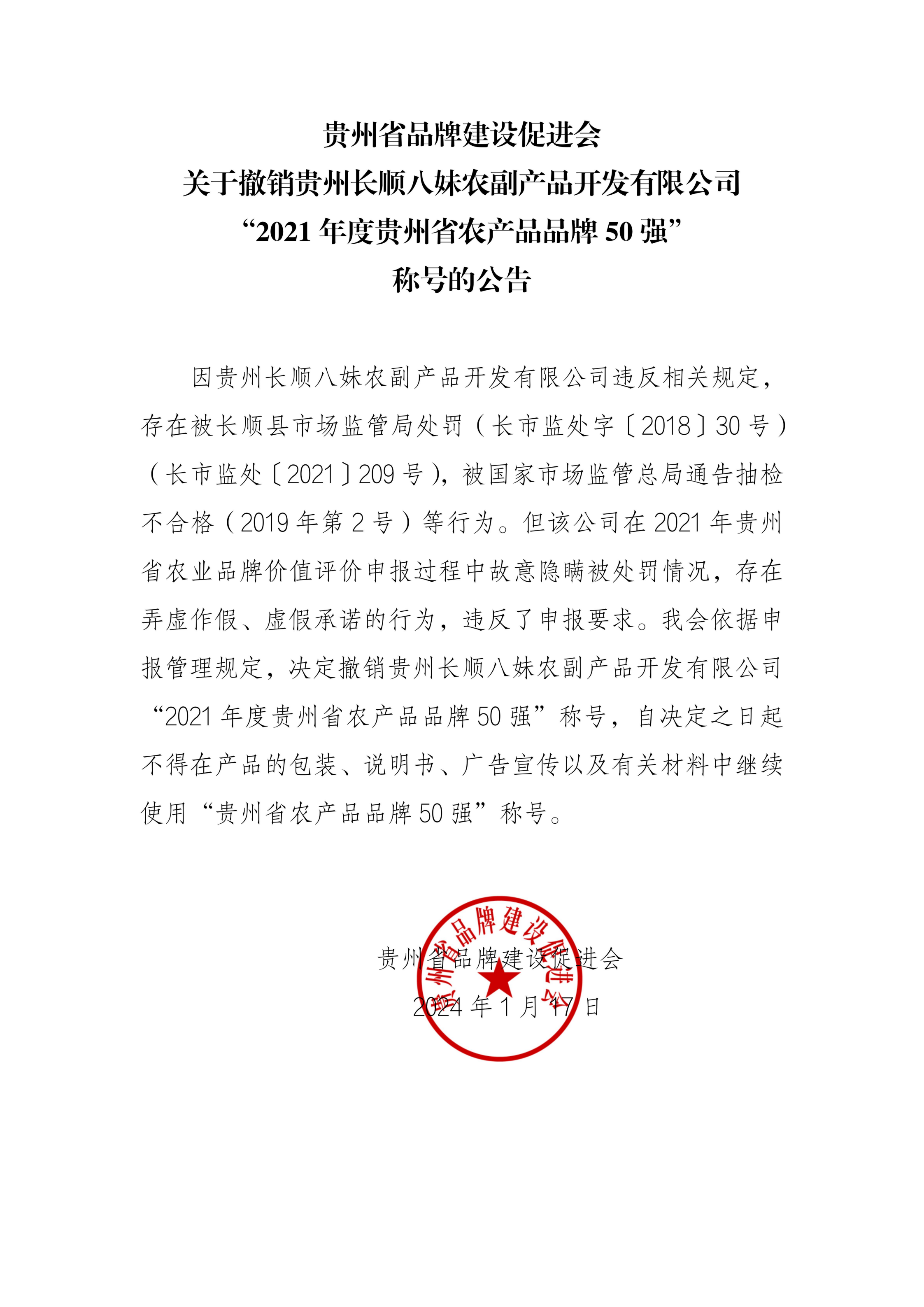 贵州省品牌建设促进会关于撤销贵州长顺八妹农副产品开发有限公司“2021年度贵州省农产品品牌50强”称号的公告