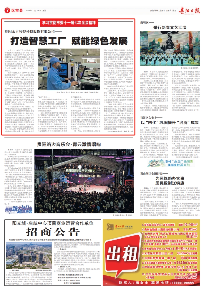 1月23日,《贵阳日报》刊发文章《贵阳永青智控科技股份有限公司——打造智慧工厂 赋能绿色发展》,报道永青智控智慧工厂建设、探索推进制造业数字化智能化的情况,报道全文如下。