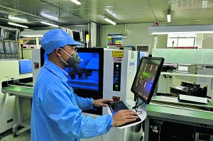 工作人员在仪表生产车间自动化SMT无铅生产线操作作业