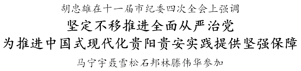 贵阳网·甲秀新闻讯 1月29日,省委常委、市委书记胡忠雄出席十一届市纪委四次全会并讲话。他强调,要坚持以习近平新时代中国特色社会主义思想为指导,深入学习贯彻习近平总书记关于党的自我革命的重要思想,认真落实二十届中央纪委三次全会、十三届省纪委三次全会精神,坚定不移推进全面从严治党,为推进中国式现代化贵阳贵安实践提供坚强保障。