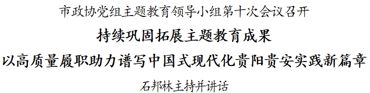 石邦林要求,要坚决扛起巩固拓展主题教育成果的政治责任,不折不扣抓好工作落实。要持续强化理论武装,坚持不懈用习近平新时代中国特色社会主义思想武装头脑、指导实践、推动工作,切实把衷心拥护“两个确立”、忠诚践行“两个维护”铭刻于心、熔铸于魂。要扎实推动问题整改,坚持“当下改”和“长久立”相结合,不断完善机制、建章立制,切实推动主题教育成果常态化长效化。要树牢为民造福政绩观,弘扬“四下基层”优良传统,用好政协“社区协商”、委员联系界别群众等,切实做到为民代言、为民建言、为民办事、为民解忧。要深入推进自我革命,狠抓作风整肃和清廉政协建设,切实推进全面从严治党向纵深发展。要围绕中心服务大局,持续聚焦市委“四主四市”工作思路和“强省会”“八个强”“五个高”等重点任务,高质量协商议政、高水平凝聚共识,奋力在助力谱写中国式现代化贵阳贵安实践新篇章中展现新作为、作出新贡献。
