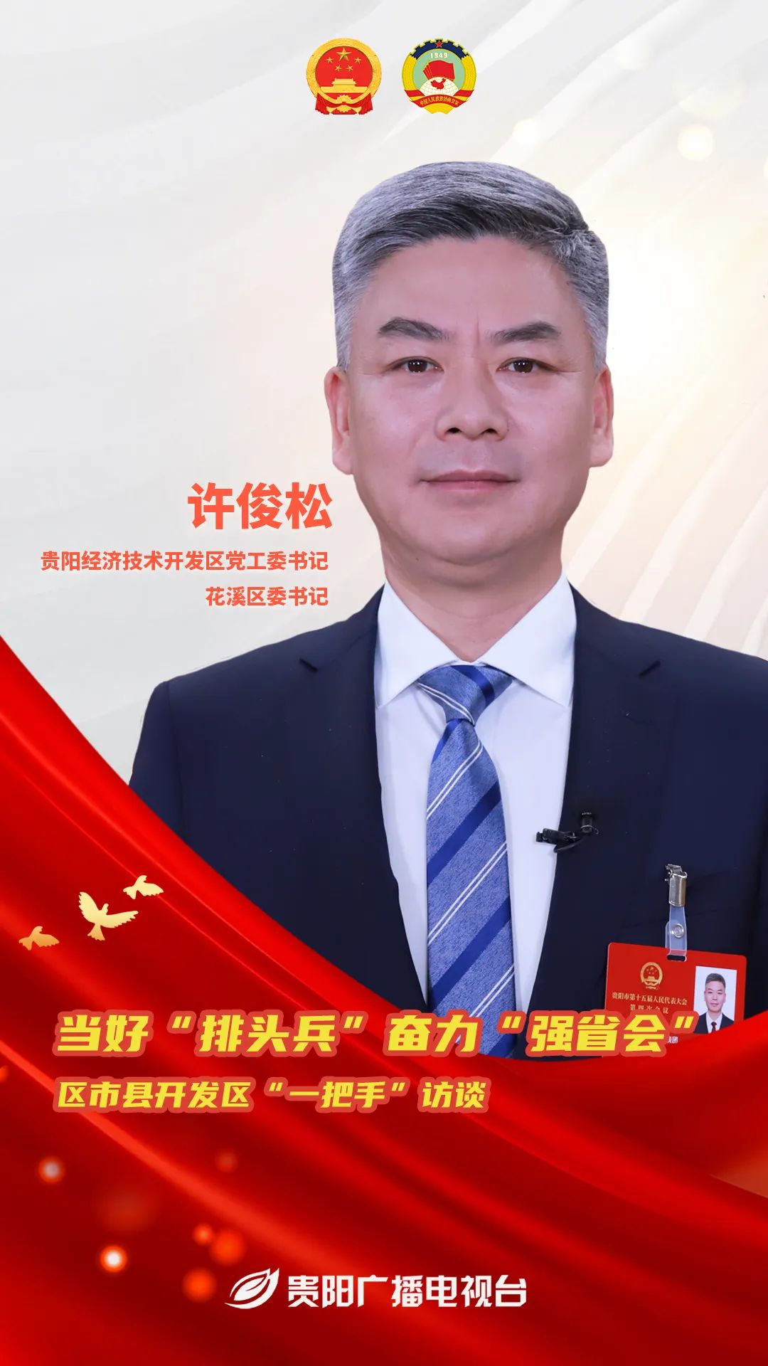 2024市两会期间,贵阳广播电视台推出特别节目《当好“排头兵” 奋力“强省会”——区市县开发区“一把手”访谈》,邀请各区(市、县、开发区)“一把手”进行专访,总结各区(市、县、开发区)2023年的工作成绩,擘画2024年的工作蓝图。今天专访贵阳经济技术开发区党工委书记、花溪区委书记许俊松。