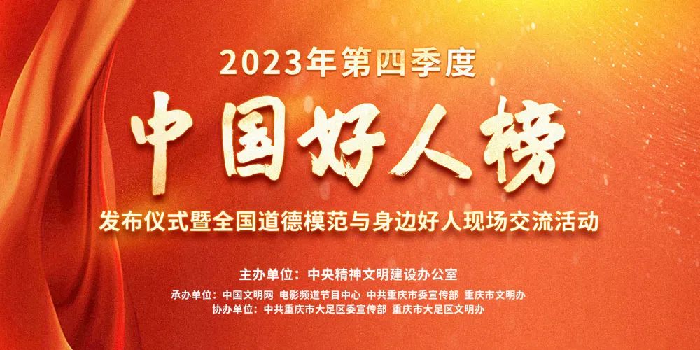 2023年第四季度“中国好人榜”发布仪式暨全国道德模范与身边好人现场交流活动,将于1月31日在重庆市大足区举办。中国文明网、电影频道节目中心、“学习强国”学习平台、人民网、新华网、光明网等多个平台将同步全程直播,网友们可以点击下方直播预约,届时收看。