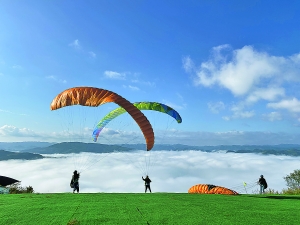 游客在云中君滑翔伞基地体验滑翔伞。