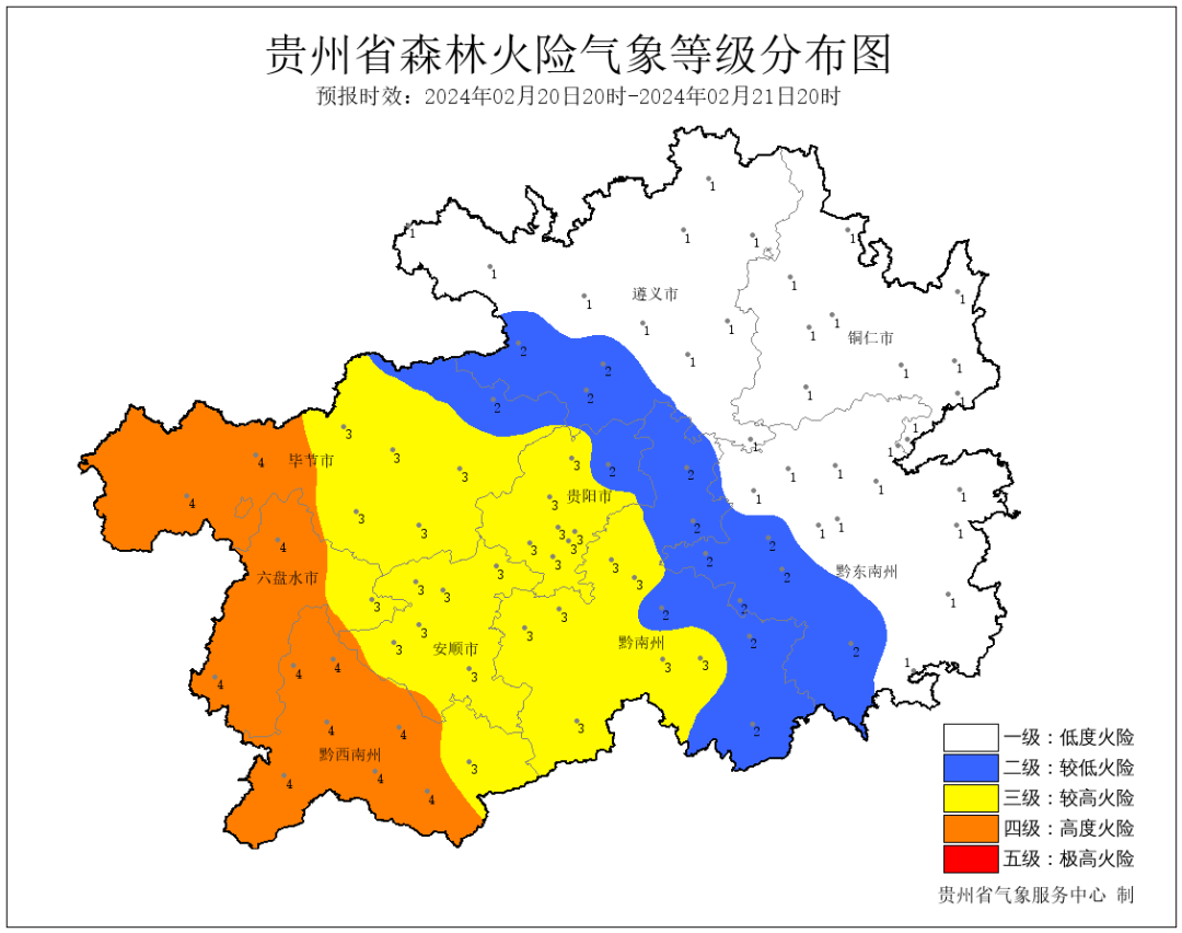 今天夜间到明天白天,遵义市、铜仁市、黔东南州大部及贵阳市东北部多云转阴天有阵雨或雷雨,局地伴有强对流天气,气温下降,其余地区多云,伴有4-6级偏南风,局地瞬时风力达6级以上,森林火险气象风险等级较高;