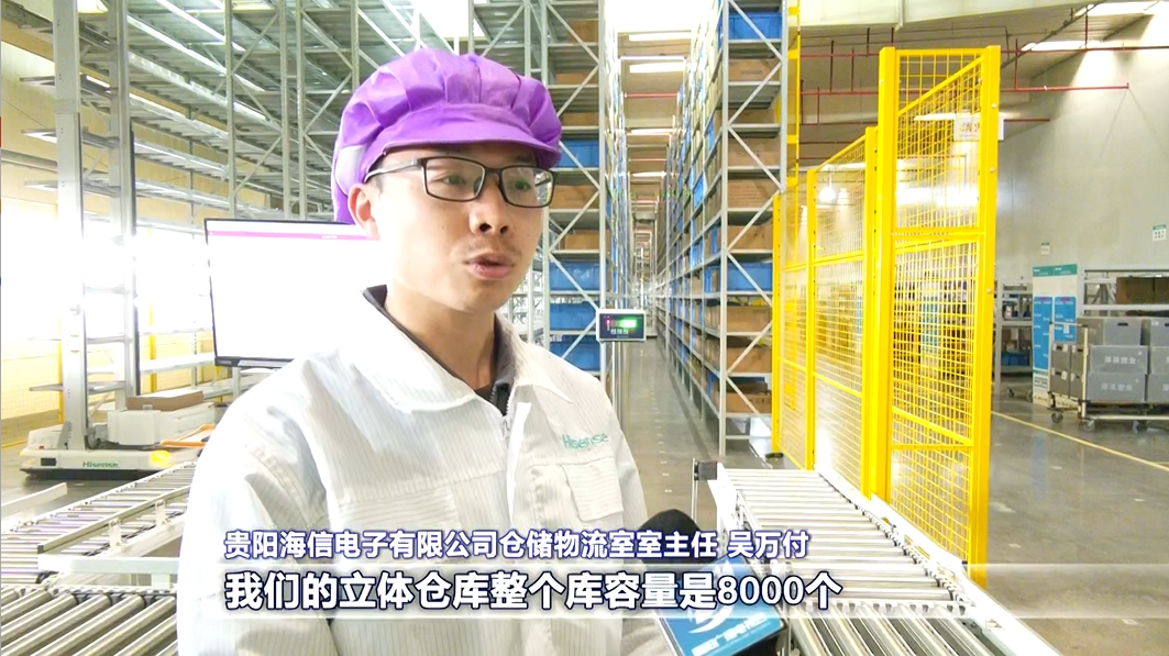 贵阳海信电子有限公司仓储物流室室主任 吴万付:我们的立体仓库整个库容量是8000个,现在一天的入库的频次差不多为1673箱,基本上能满足现在6条线体的产能。