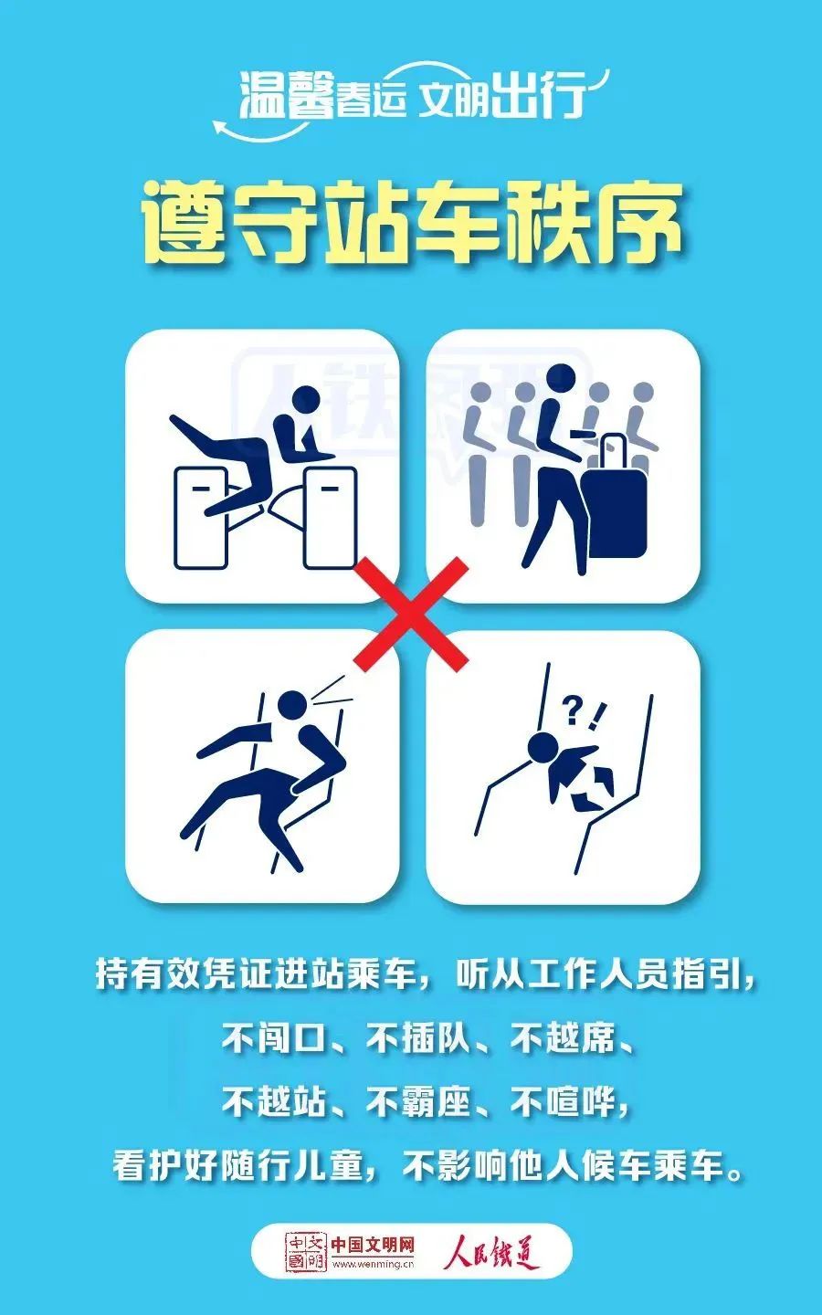 1. 遵守站车秩序。持有效凭证进站乘车,听从工作人员指引,不闯口、不插队、不越席、不越站、不霸座、不喧哗,看护好随行儿童,不影响他人候车乘车。