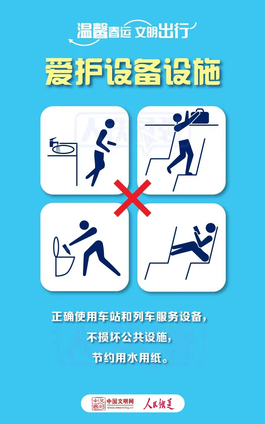 4. 爱护设备设施。正确使用车站和列车服务设备,不损坏公共设施,节约用水用纸。