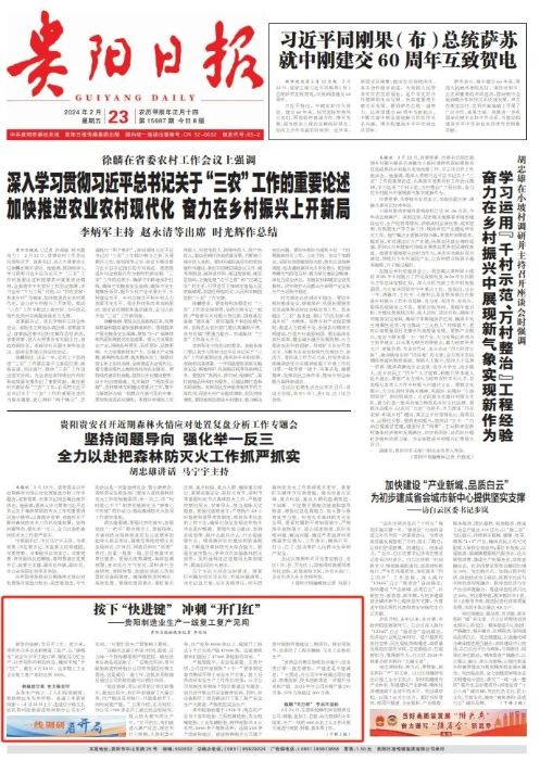 2月23日,《贵阳日报》头版刊发稿件《按下“快进键” 冲刺“开门红”——贵阳制造业生产一线复工复产见闻》,报道贵州轮胎、贵阳险峰铆足干劲抢工期、赶订单,奋力冲刺“开门红”的繁忙景象,具体报道内容如下。