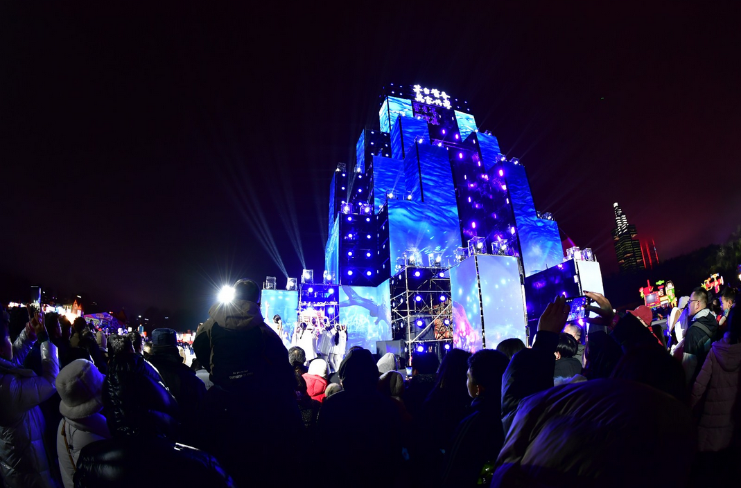 市民游客在“驰骋天地”灯组舞台前观看表演