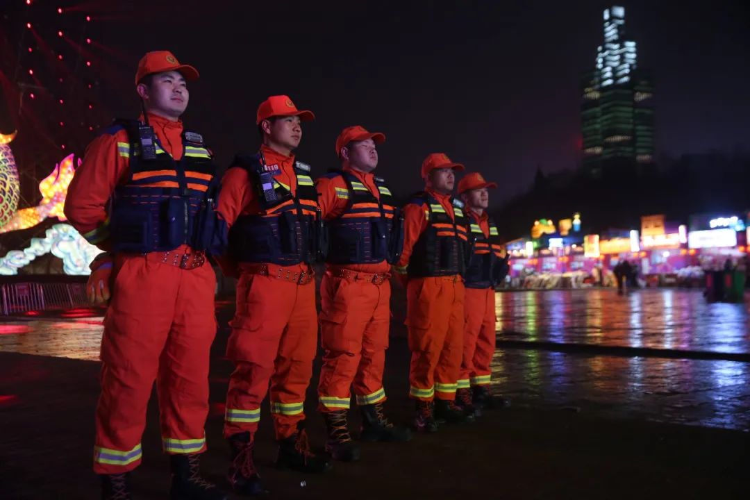 “先生,这个舞台马上有表演,请您配合走下来,谢谢!”在千灯万彩中,红蓝闪烁的警灯、四处巡逻的特警、随处可见的安保人员、严阵以待的消防官兵,以及默默维护环境卫生的保洁人员……这些都让市民游客在观灯逛市时倍感安心与踏实。
