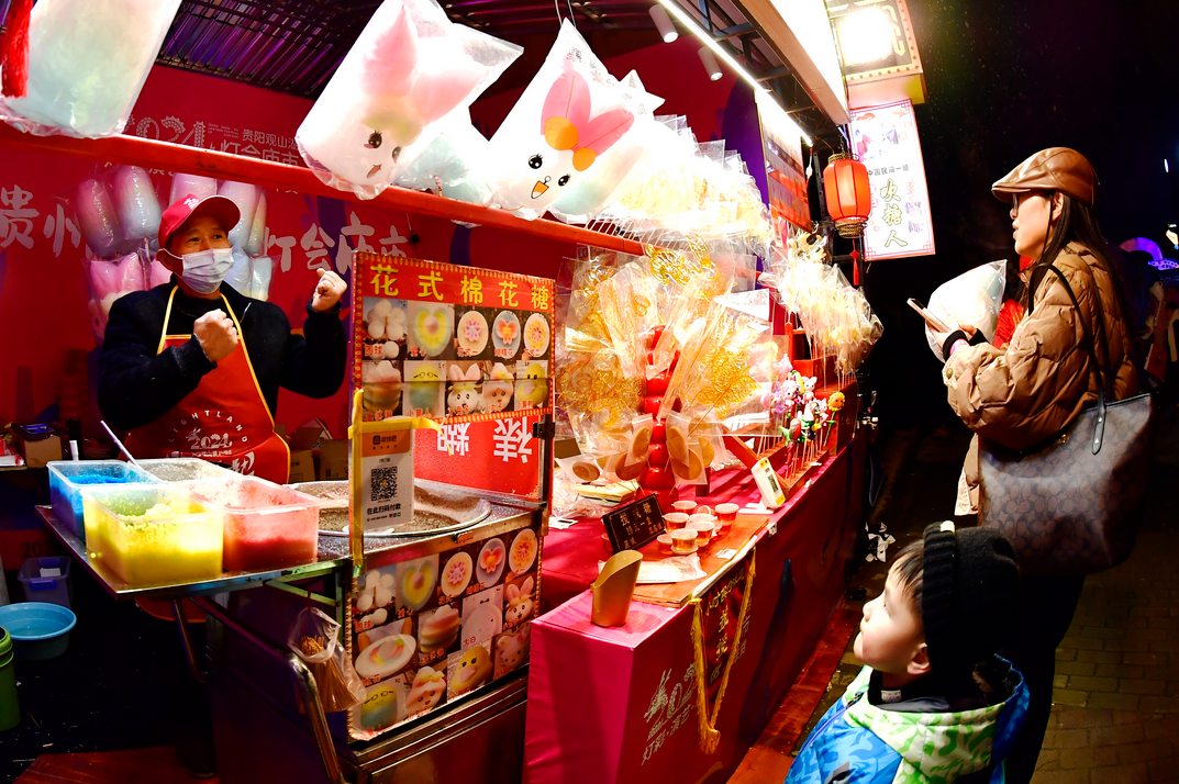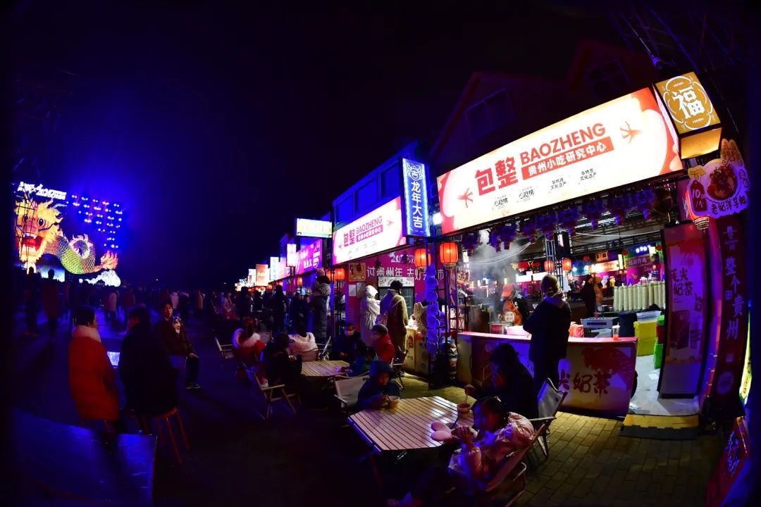 不光是灯组别具传统、本土文化特色,庙市上的美食店铺也不甘被”埋没“——打糍粑、画糖画等传统习俗从不失约;店铺上的“正儿八经”“三天不吃酸 走路打蹿蹿”“豁皮”“二麻二麻”等方言,让浓浓的“贵州味儿”扑面而来。此外,两大灯王舞台上包含民族、民俗、歌舞、杂技、魔术、戏剧、相声、脱口秀等一系列的艺术融合形式,演绎出贵州与世界的重逢与相遇,让游客在灯会庙市中感受到浓厚的贵州年俗文化,感叹“中华文化的博大精深”。