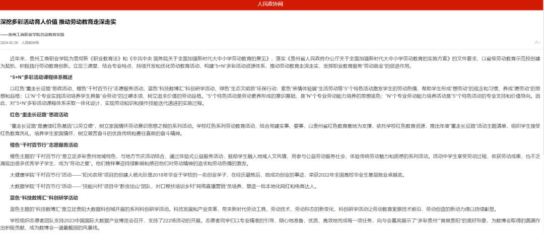 贵州工商职业学院坚持深耕劳动教育。近期,学校“5+N”多彩劳动课程体系建设成果,受到人民政协网的关注和报道,并对学校在劳动教育上不断探索,取得育人模式创新、课程体系不断丰富的实践成果给予充分肯定。