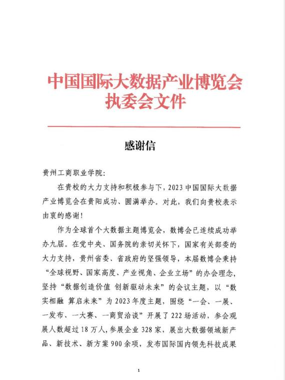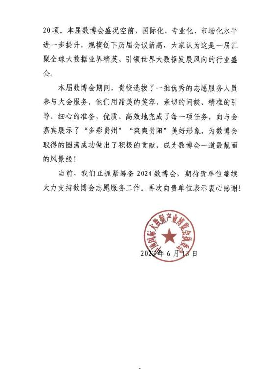 “2023中国国际大数据产业博览会”组委会对志愿者服务的感谢信