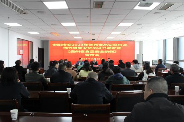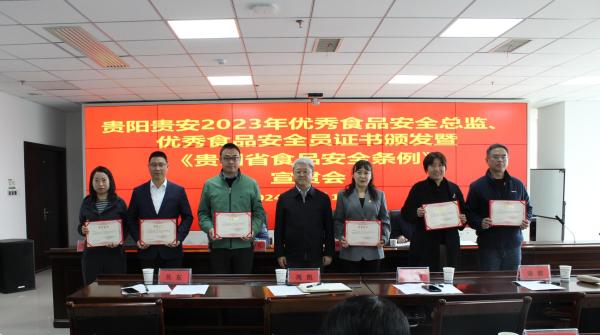 会议对2月1日施行的《贵州省食品安全条例》作宣贯。宣读了《市政府食药安办关于对2023年贵阳贵安优秀食品安全总监和优秀食品安全员予以表扬的通报》;为评选出的优秀食品安全总监、优秀食品安全员代表颁发了荣誉证书。为促进企业相互交流学习,优秀代表表态发言,分享经验,为大家讲述在食品安全方面的做法以及取得的成果。