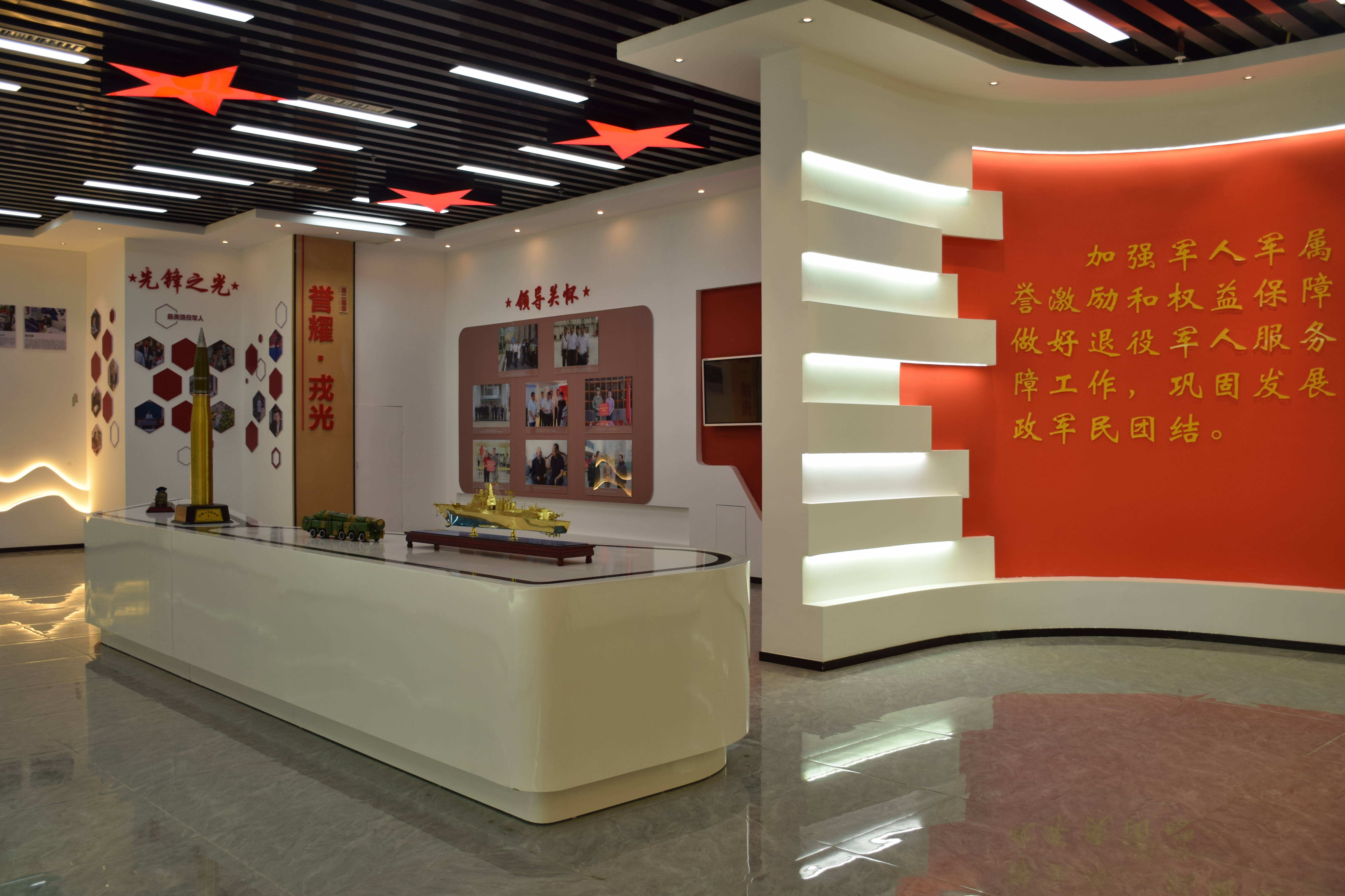 展馆包含了改革开放以来党历史上的重要会议,省市区相关领导前来调研指导工作,以及每逢春节、八一走访慰问驻区部队、退役军人及优抚对象的情景,也包含了区“兵+X”退役军人作用发挥的代表及“最美退役军人”风采展示,它以抓党建提升引领高度,抓基础提升保障力度,抓氛围提升尊崇厚度,抓作用提升发挥热度,抓作风提升服务温度这五个方面作为工作思路,通过开展老兵宣讲、“我们的节日”、热热闹闹上门送喜报等活动,以及省“一件事一次办”试点工作推进,提升关爱、尊崇力度和氛围,建立了两项“教育”机制、做实了三大“服务”平台、强化了四个“管理”体系。