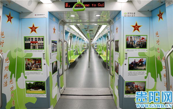 贵阳市“强军号”地铁专列于2021年7月30日发车,是贵州省首列强军主题地铁专列。“强军号”地铁专列已成为国防教育的“移动课堂”,走进第一节车厢,迎面看到的是中国人民解放军三军仪仗队高举军旗和“听党指挥、能打胜仗、作风优良”的醒目标语,令人精神振奋。