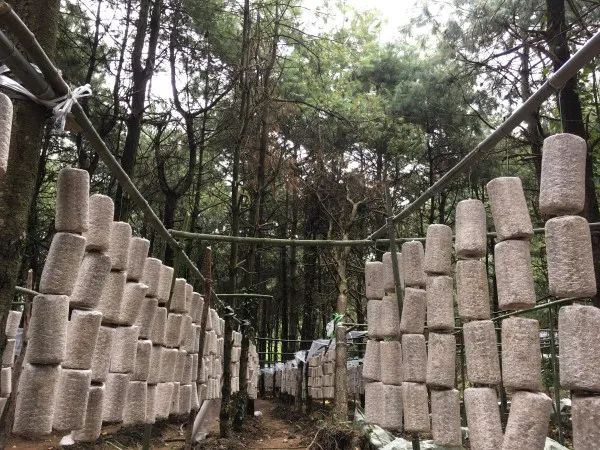 走进林下木耳基地里,木耳菌棒整齐排列着。