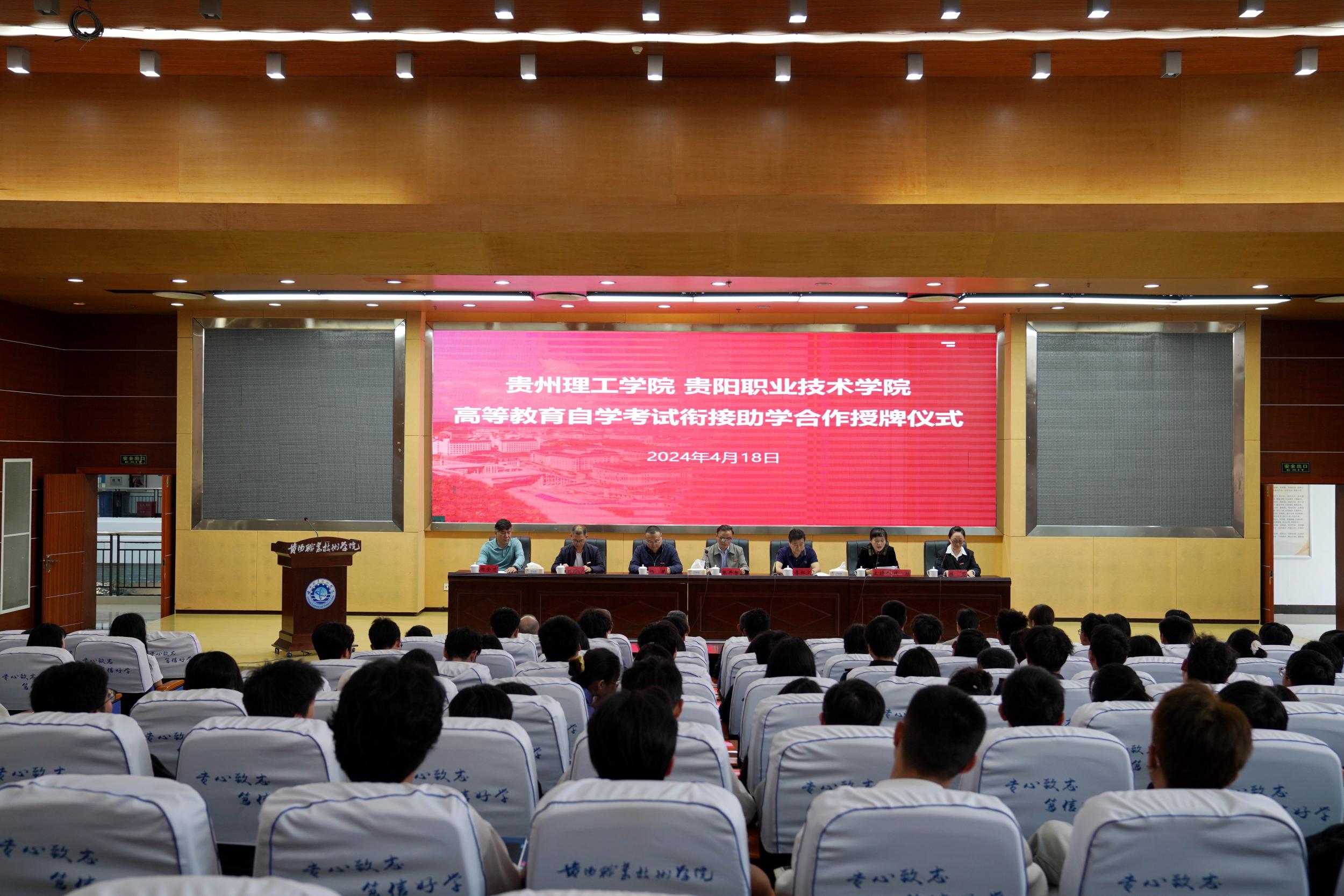 贵阳网·甲秀新闻讯 4月18日,贵州理工学院与贵阳职业技术学院高等教育自学考试衔接助学合作授牌仪式在贵阳职院举行,此举将进一步拓宽贵阳职院学生“专升本”升学通道,为职院在籍在校生学历提升提供更多选择和更优质的学习服务支持。