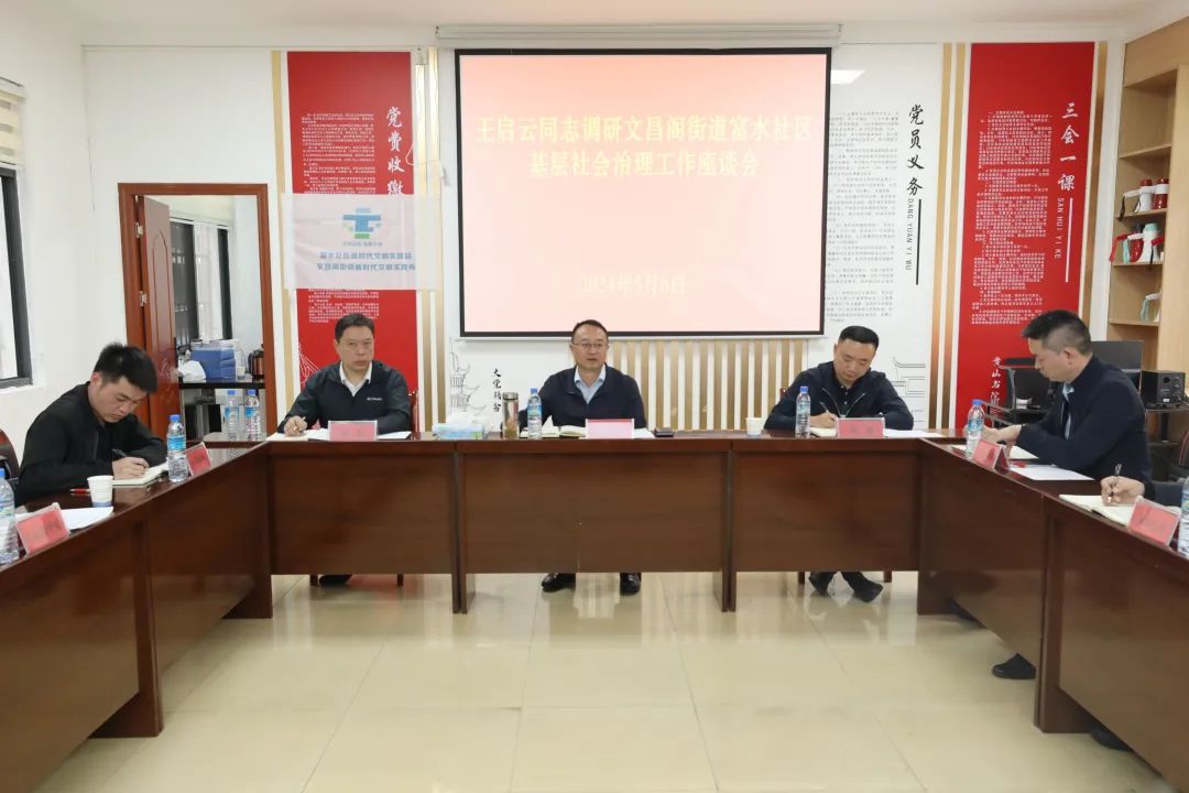 王启云一行来到文昌阁街道富水社区,与富水社区“两委”成员召开座谈会,认真听取社区基本情况、人才队伍建设,网格员、联户长履职等情况汇报,征询关于基层减负的意见建议,现场研究解决存在的困难和问题。