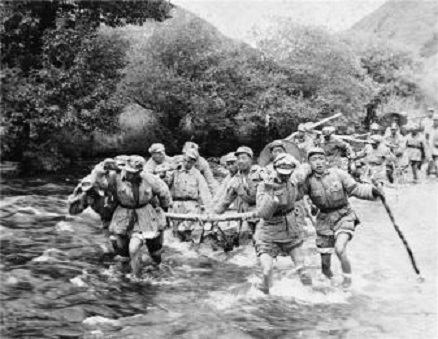 1950年,筑路大军挺进西藏途中,官兵们在冰冷刺骨的河水中抬运石料