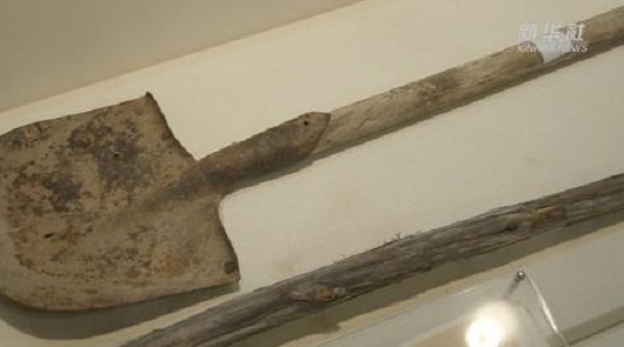 西藏军区军史馆收藏的一把铁锹。这是修筑川藏公路时,战士们使用的工具。修筑公路时,西藏运输总队政委慕生忠曾在铁锹把上刻下“慕生忠之墓”。他说,如果我死在这条路上,这就是我的墓碑