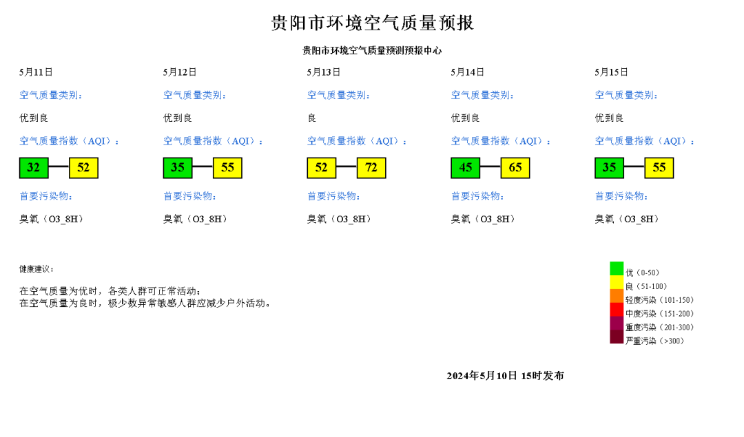 预计贵阳市范围2024年5月11日空气质量指数(AQI)范围:32~52;空气质量类别:优到良;首要污染物:臭氧(O3_8H)。