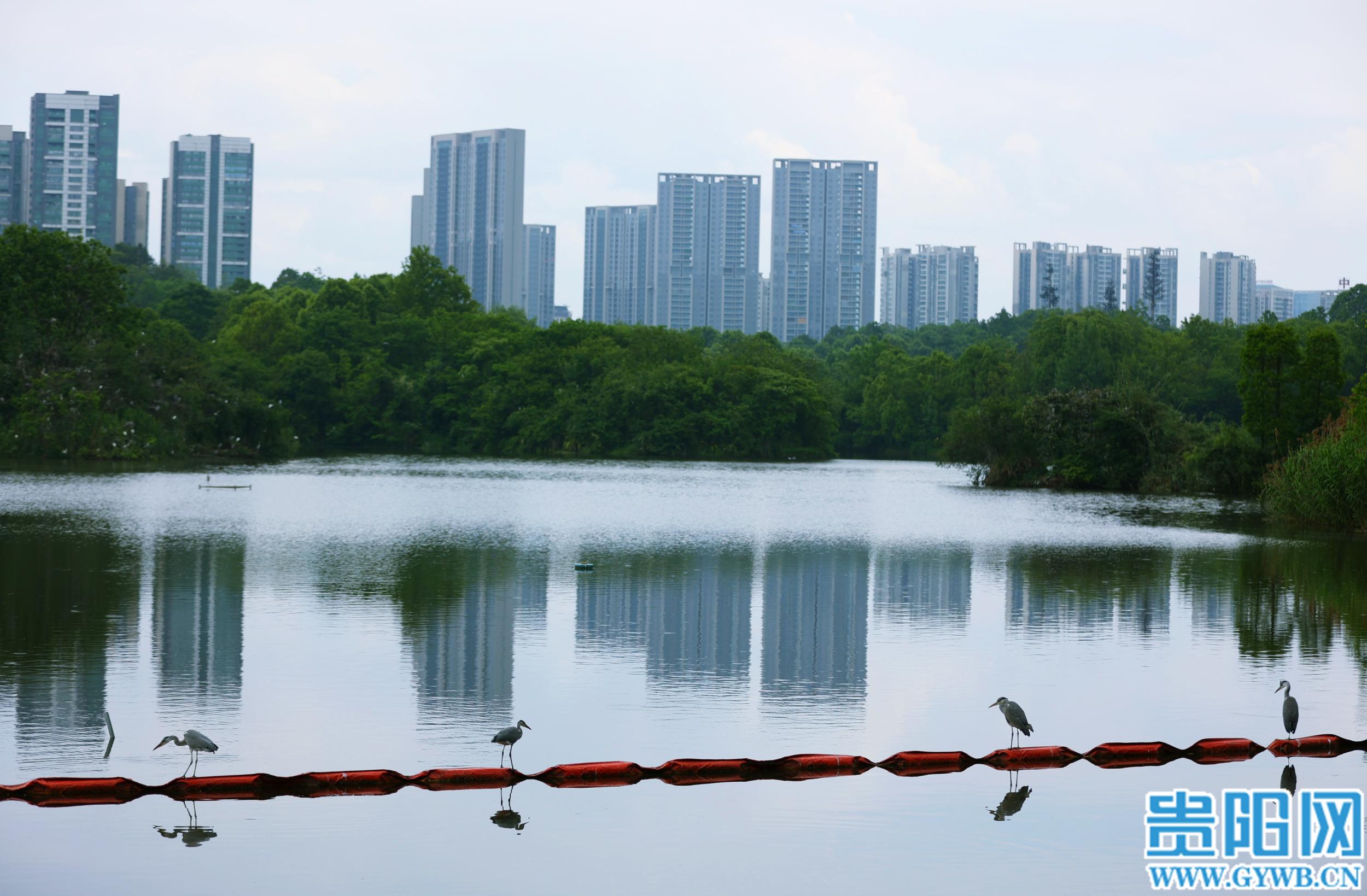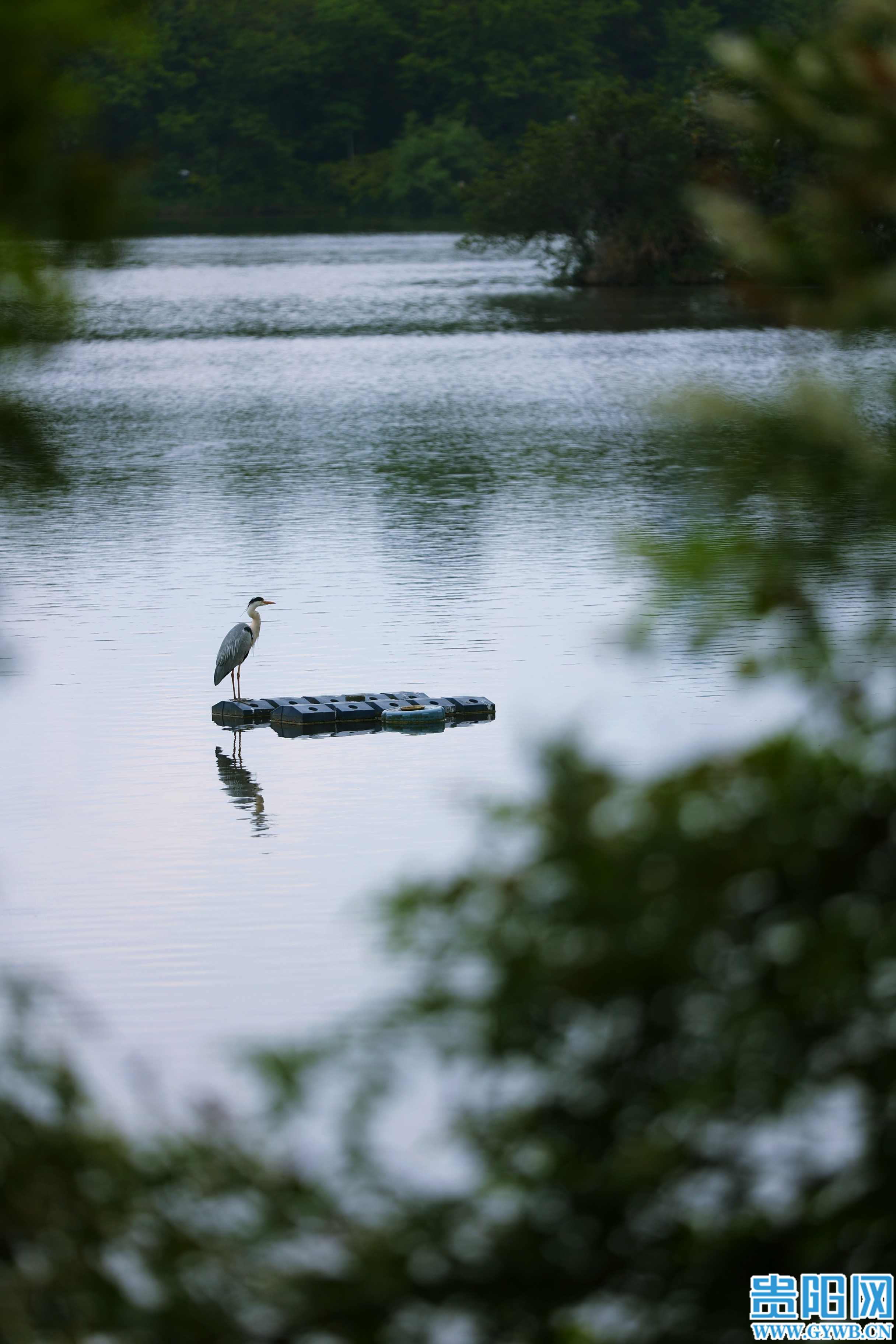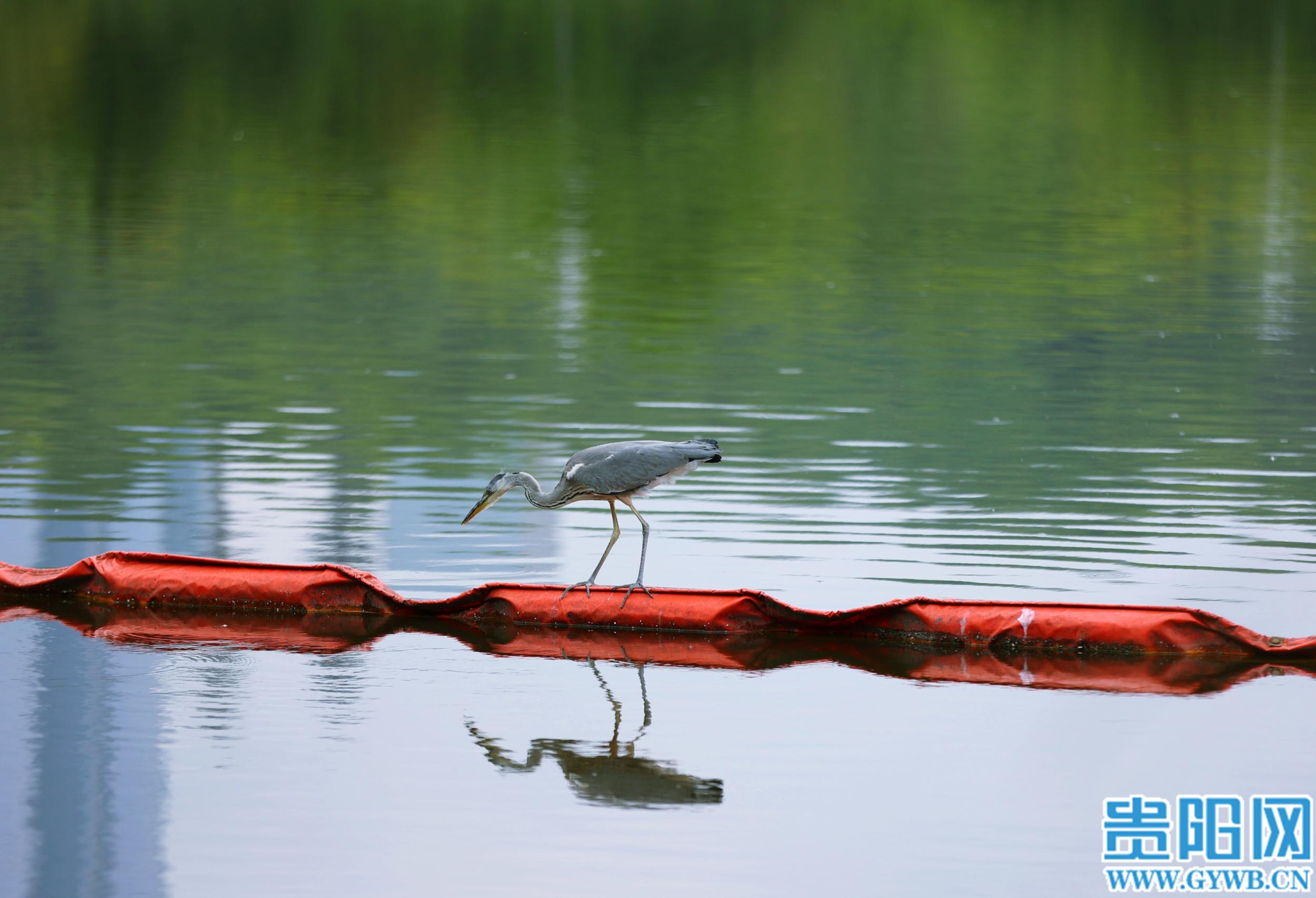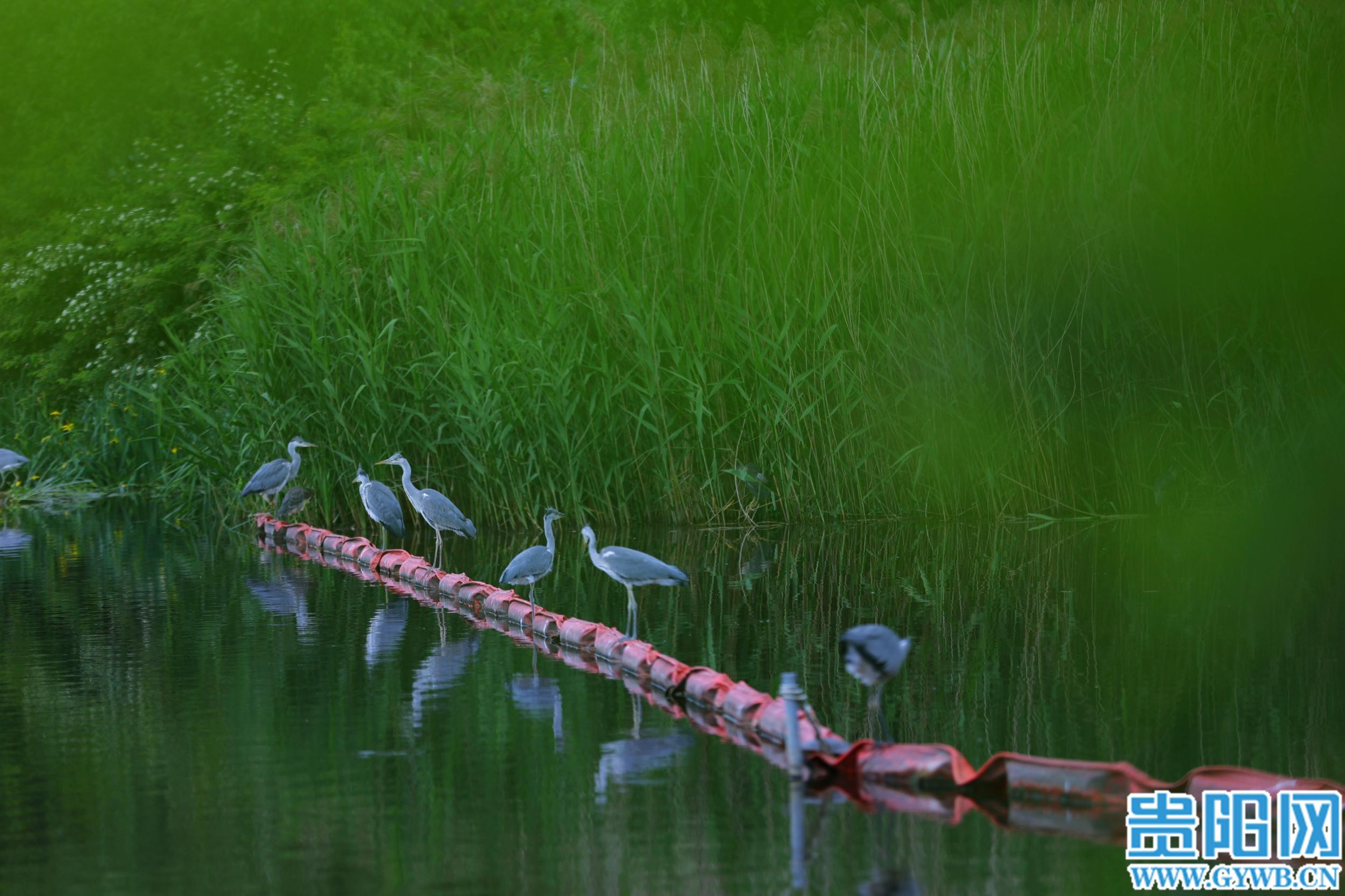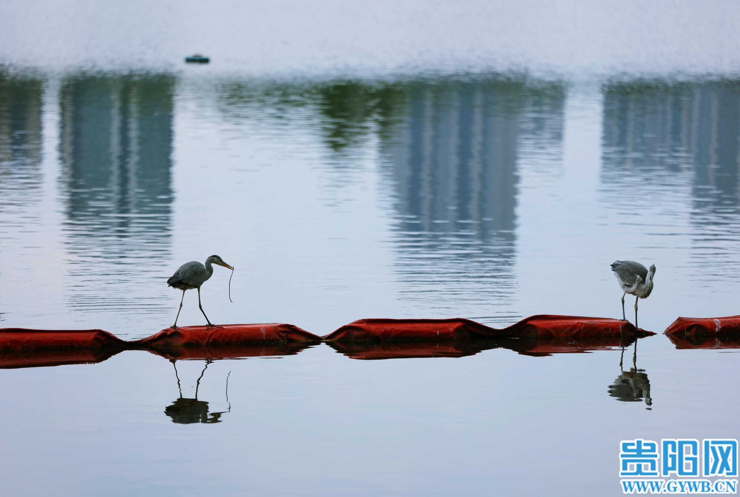 贵阳网·甲秀新闻讯 5月13日,在观山湖公园,体型硕大的苍鹭成排站在湖中的浮标上觅食,苍鹭修长的身姿倒影在清澈的湖水中,形成极为有趣的优美画面。此时,山、水、鸟在这里形成如诗如画般迷人的湖光山色风景,不少游客见状,纷纷停下脚步拿出手机拍个不停。