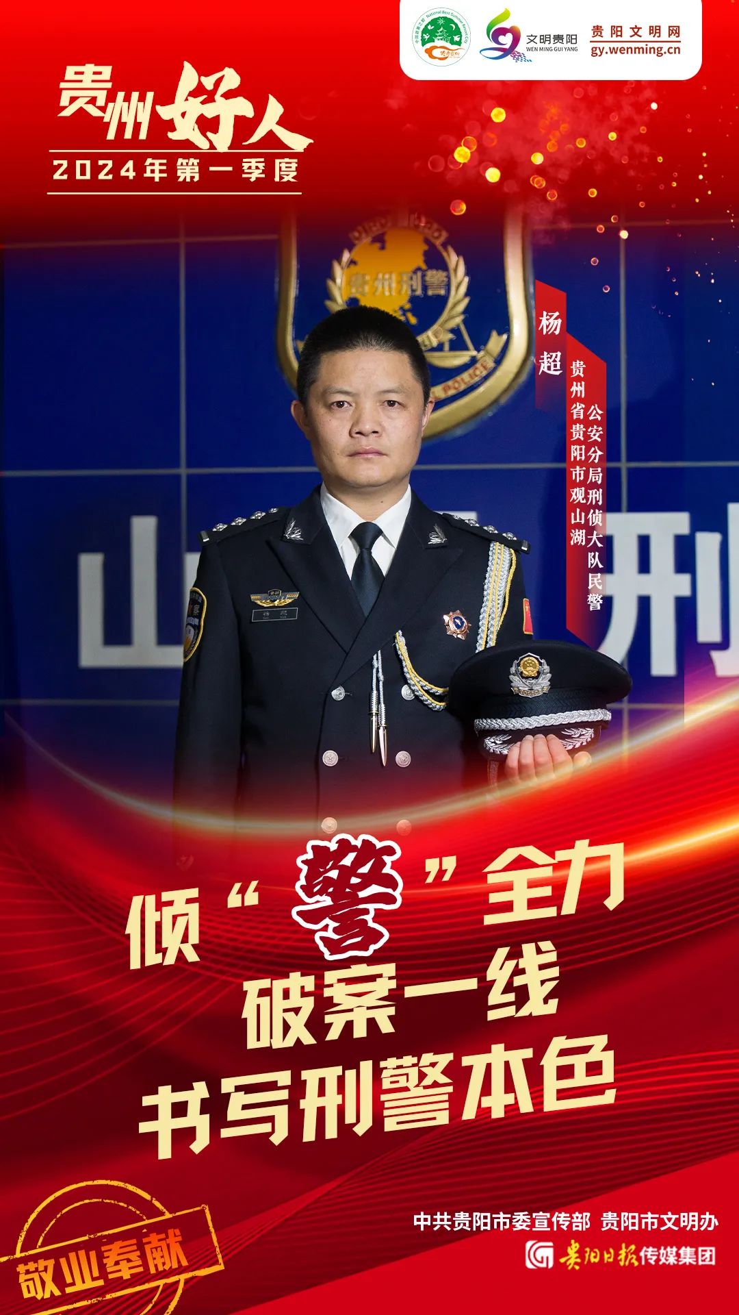 近日,记者从贵州文明网获悉,2024年第一季度“贵州好人榜”发布,其中,贵阳市观山湖区公安分局刑侦大队民警杨超以敬业奉献当选“贵州好人”。