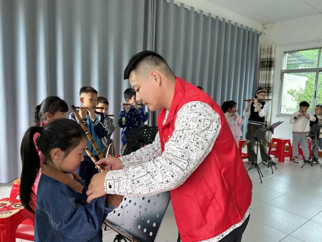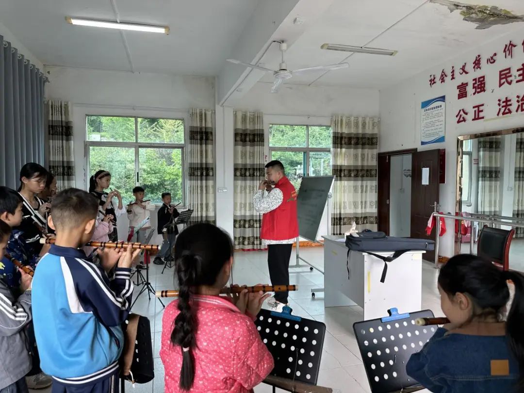 培训期间,志愿者老师为参训学生们进行了笛子入门教程培训。他用简洁有趣的话语,从持笛姿势、运气方法、单音练习等方面,由浅入深地细致讲解。在老师的指导下,孩子从不能吹响笛子到笛声响亮,从吹3个音到能吹6个音,收获很大。百花湖镇竹林村的石女士也为孩子报名参加了本次竹笛公益特色班,她说:“看着自己的孩子如此认真地学习,能够勇敢地表演,内心非常高兴。”