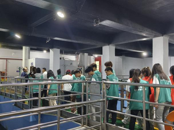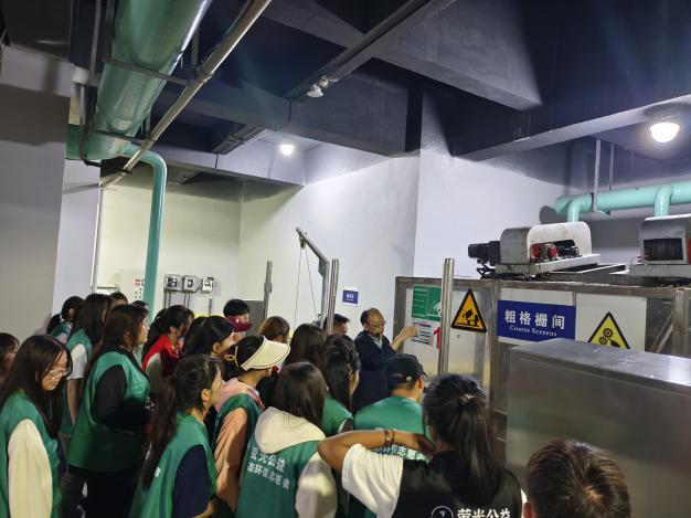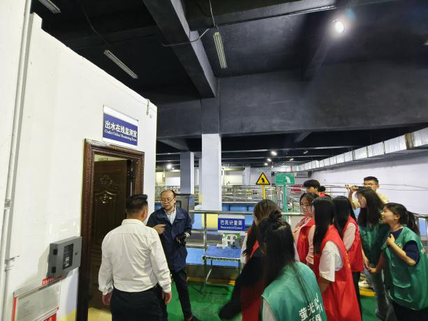 “同学们,在水排入河流的最后一道工序就是尾水消毒,利用适当波长的紫外线,破坏微生物机体细胞中的DNA或RNA的分子结构,造成生长性细胞死亡和再生性细胞死亡,达到杀菌消毒的效果。”工作人员详细介绍,志愿者们认真听讲。从满是藻类河沙的河水到清澈的中水,志愿者们了解了再生水的来源、处理工艺和应用领域,亲身见证了污水变清的过程。