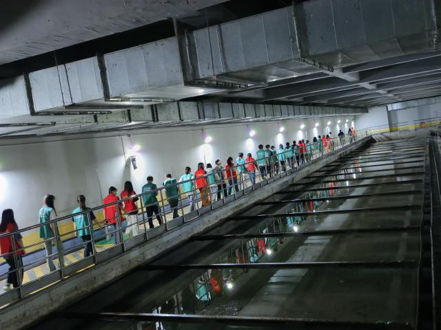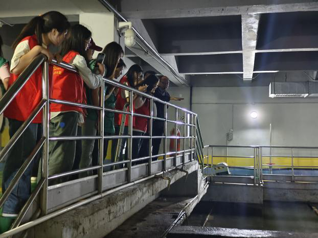 “水通过预处理、生化处理和深度处理,达标后继续排入南明河中……”在工作人员的带领下,志愿者们参观了再生水厂的处理设施和车间。在预处理车间,通过粗、细两级格栅,去除污水中大于5mm的杂质,通过曝气沉沙池去除粒径大于0.2mm 的无机砂粒,也保护后续流程的管道、水泵等设施正常工作。走进高效沉淀池,志愿者们沿着栏杆继续观察,这个集混合、絮凝反应、沉淀、污泥浓缩等功能于一体的车间,可以有效去除SS、COD、TP等污染物。尤其是生化池利用创造的厌氧、缺氧、好氧条件去除有机物、氮、磷等污染物,是二级处理的核心工段。