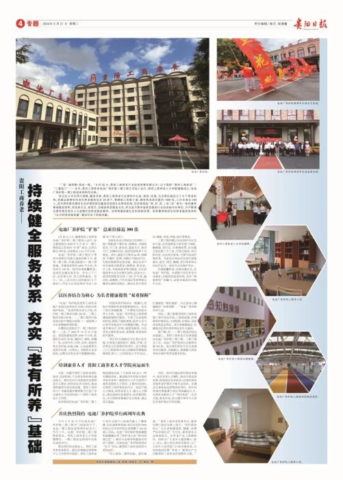 5月21日,《贵阳日报》刊发专题报道《贵阳工商养老持续健全服务体系夯实“老有所养”基础》,对近年来贵阳工商养老产业投资发展有限公司精心布局养老产业链有关举措进行宣传,重点关注电池厂养护院二期工程正式投入运行、工商养老人才学院揭牌成立、电池厂养护院一期工程两周年庆典等,具体内容如下。