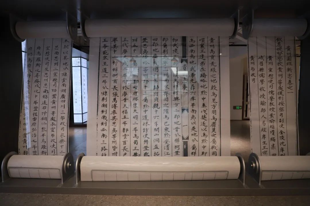 随着参观的深入,记者在各展示区看到了贵州印刷厂在雕版与活字印刷、铅印与石印、综合性印刷三个时期所使用的印刷器材,其中,位于左右两侧卷轴上的字,则是源于贵州现存最早的雕版印刷品弘治《贵州图经新志》。