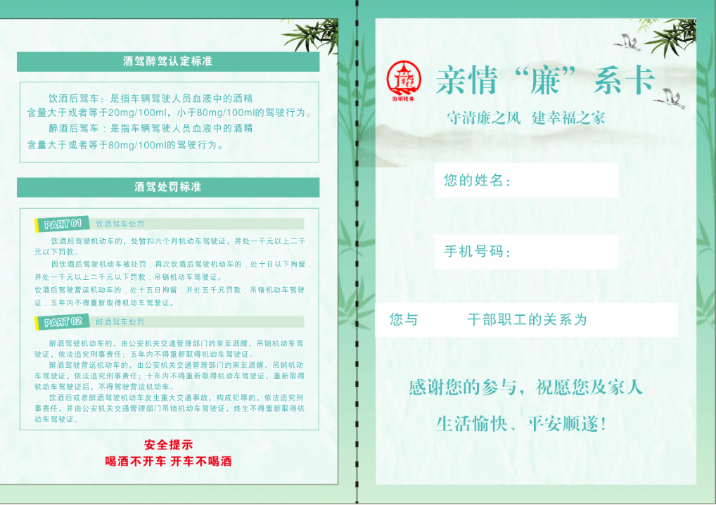 亲情“廉”系卡还包含了酒驾醉驾认定标准及处罚标准,旨在强化干部职工及家属纪法知识,引导干部职工及家属算好酒驾醉驾“政治账”“法律账”“前途账”“经济账”“亲情账”,邀请家属共建安全安心之家,坚决杜绝酒驾醉驾等非职务违法犯罪发生。亲情“廉”系卡留有回执页,家属留存联系方式。