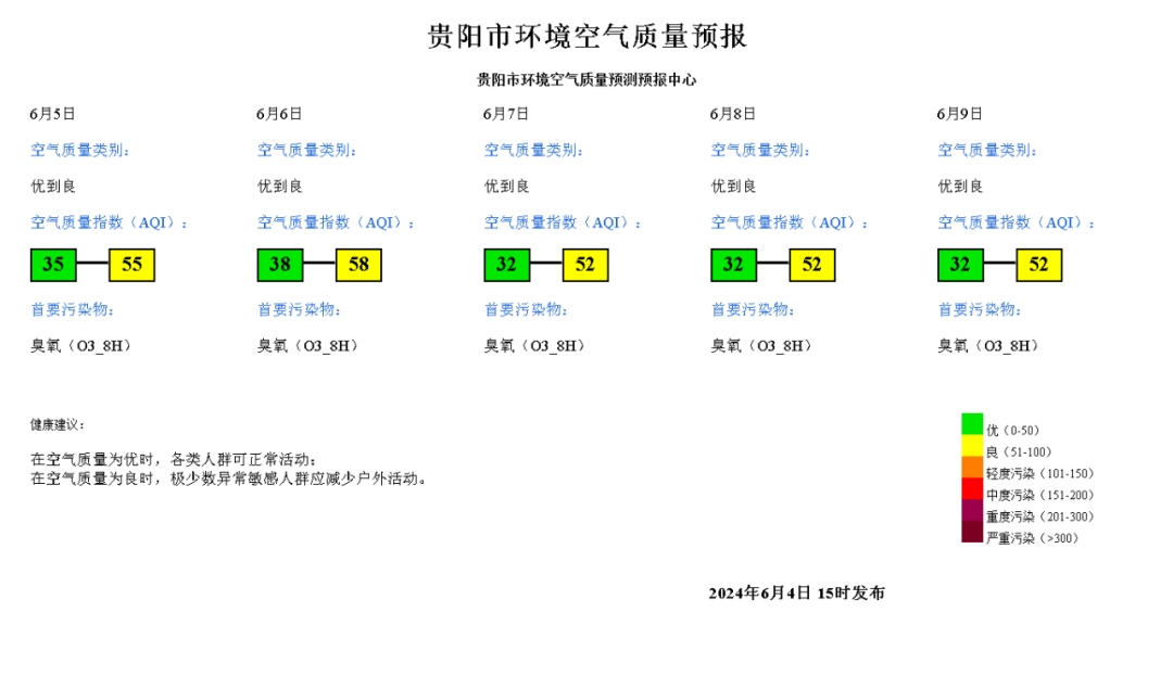 预计贵阳市范围2024年6月5日空气质量指数(AQI)范围:35~55;空气质量类别:优到良;首要污染物:臭氧(O3_8H)。